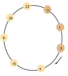 4. In a ring based algorithm, explain what happens when a node fails? Using the following figure, give a step by step illustration with messages. Assume node 24 (leader) crashed. Show communication between 15 and 24. [S37-45]